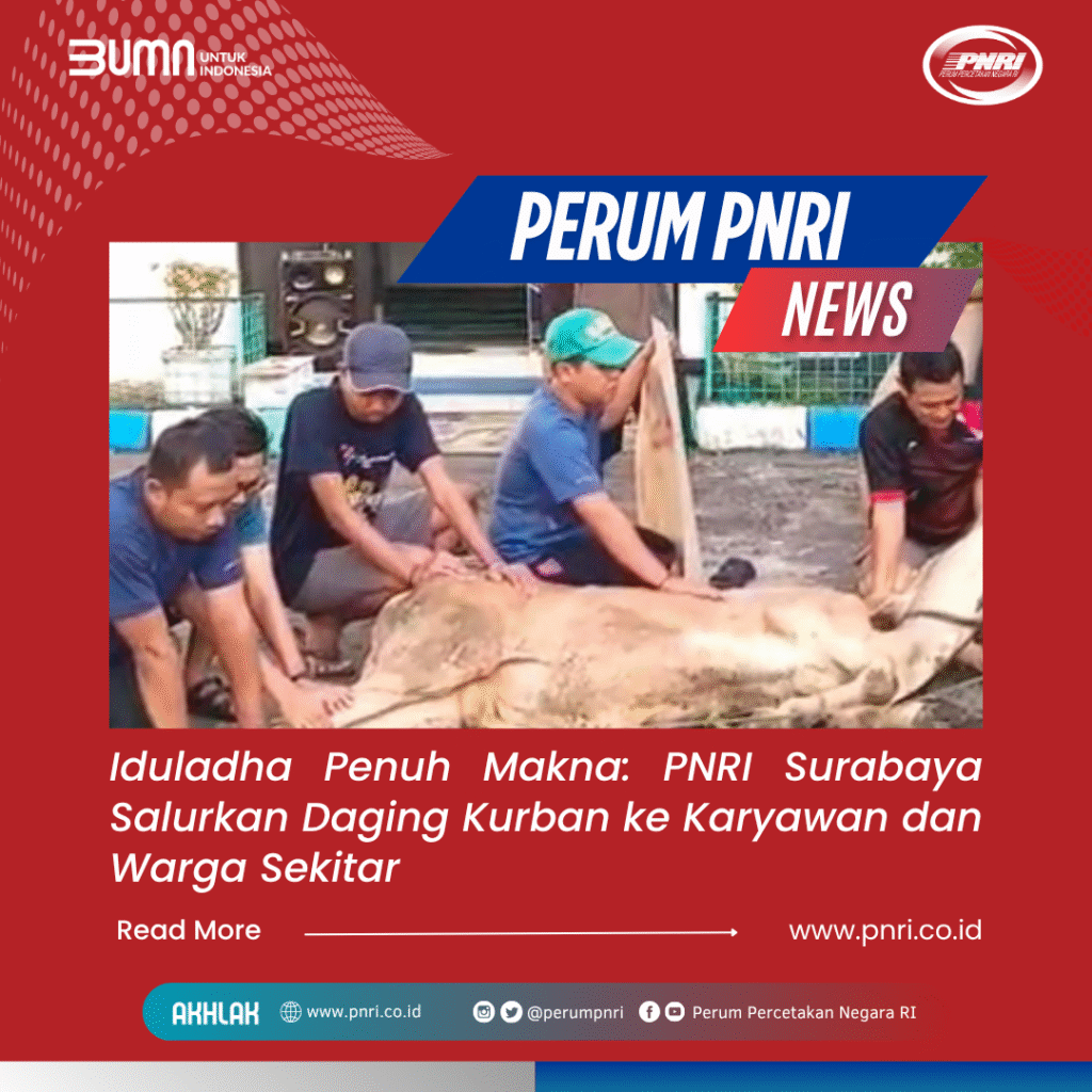 Surabaya, 13 Juni 2025, Dalam rangka memperingati Hari Raya Iduladha 1446 H kemarin, Perum PNRI Cabang Surabaya melaksanakan kegiatan penyembelihan hewan kurban sebagai wujud kepedulian dan semangat berbagi. Kegiatan ini berlangsung pada Jum’at, 6 Juni 2025, di halaman kantor cabang, dan diikuti dengan antusias oleh jajaran karyawan serta masyarakat sekitar.