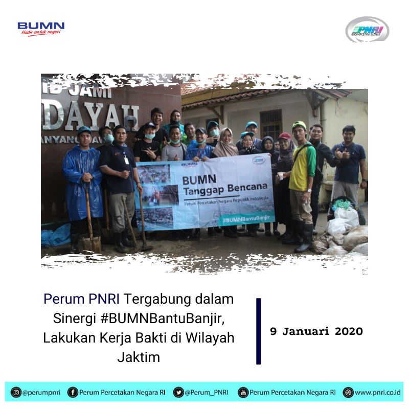 Jakarta (9/1), Perum Percetakan Negara RI (Perum PNRI) dengan BUMN lainnya yang tergabung dalam sinergi #BUMNBantuBanjir melakukan kerja bakti (bersih-bersih) paska banjir di 4 lokasi Kelurahan Cawang diantaranya Tanjung Sanyang, daerah Jalan Arus, serta pemukiman yang berada di belakang RS Budi Asih dan sekitar Kampus Binawan. Perum PNRI yang didominasi oleh belasan Millenial sangat antusias dengan kegiatan ini. Seperti dikutip dari PT Wijaya Karya (WIKA) sebagai Koordinator kegiatan #BUMNBantuBanjr, Sebanyak 250 personil yang terdiri dari karyawan BUMN, Sudin Sumber Daya Air Jakarta Timur maupun masyarakat turut terlibat pada kegiatan tersebut.